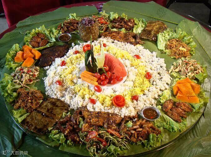 | 找好一个干净的簸箕铺上芭蕉叶,然后把煮好了米饭倒在中间,旁边铺上做好的菜…… |