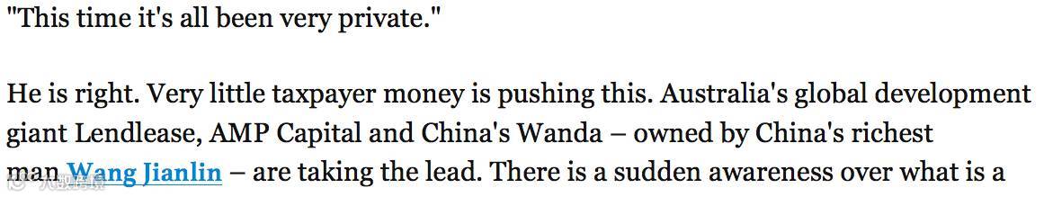 据悉,这样庞大的工程,纳税人贡献的金额只是很小一部分,真正有话语权的是澳洲全球开发巨头Lendiease,AMP capital以及一个熟悉的名字:来自中国的万达集团!
