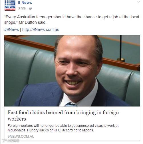 据报道,移民部部长Peter Dutton宣布,即将废止前政府的快餐业劳务协议 ,不再招收持有457签证的外国务工人员。