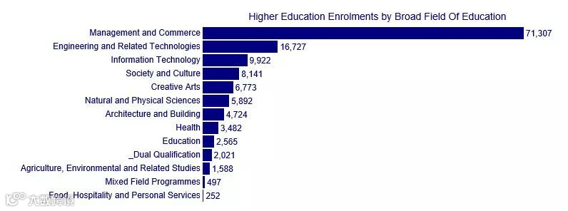 再来看课程方面,最受留学生欢迎的课程是Management& Commerce,就读人数遥遥领先。另外,Engineering和 IT 也是热门课程。食品,酒店管理等仍然少有人问津。