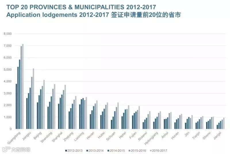 5年内签证申请量 前20位的省市