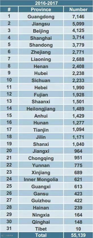 其次是江苏、北京、上海、山东、浙江、辽宁、河南、湖北和四川。