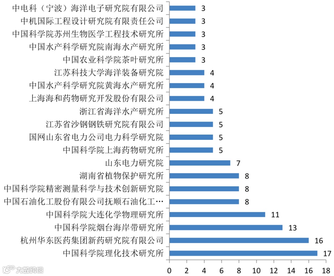 从上图可以看出,2021年中国科学院大连化学物理研究所、中国石油化工股份有限公司石油化工科学研究院、中国移动通信有限公司研究院的发明专利授权量排名前三,从专利质量来看,排名前三的科研院所中,中国石油化工股份有限公司石油化工科学研究院的专利质量最好,平均权利要求项数为22,平均说明书页数为15。