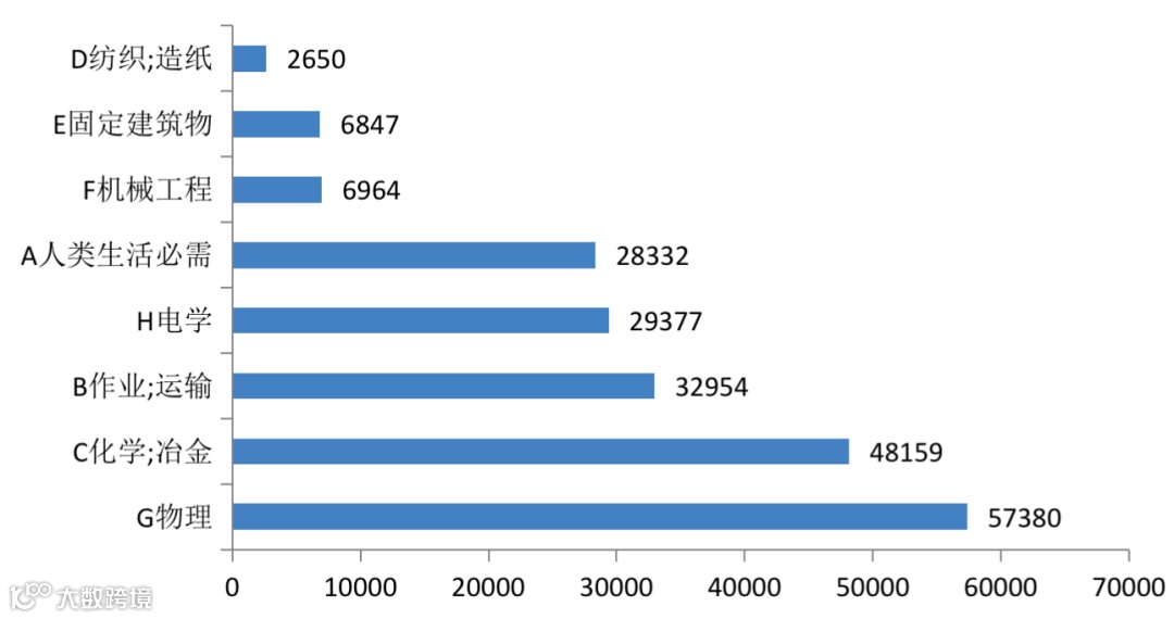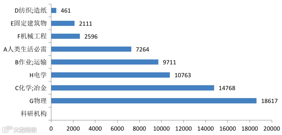 2021年高校和科研院所发明专利IPC大类主要为G物理、C化学;冶金、B作业;运输和H电学,其中高校的G物理方向的发明专利为57380件,占比27%,科研院所G物理方向的发明专利为18617件,占比28%。