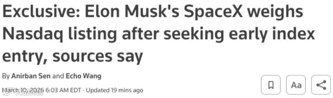 据报道,SpaceX希望将提前纳入纳斯达克100指数作为其在纳斯达克上市的条件,因为该交易所正在推行一项新的快速准入规则,旨在吸引大型市值公司上市。