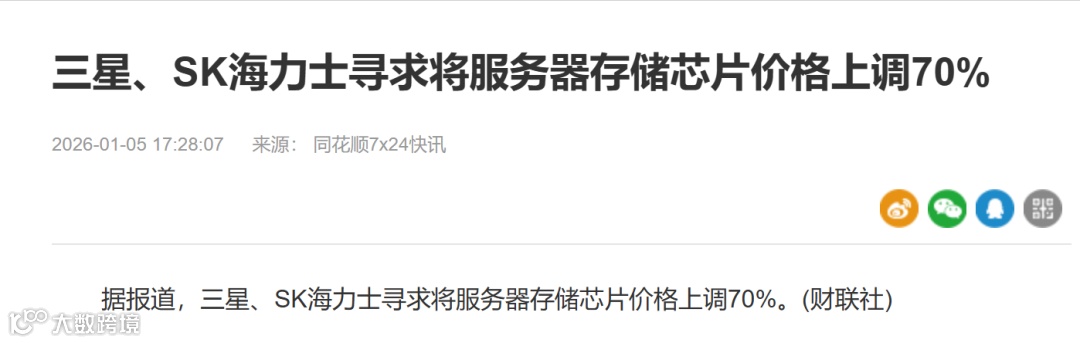 据报道,三星、SK海力士寻求将服务器存储芯片价格上调70%。