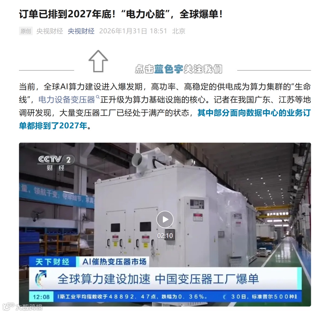 央视财经报道,记者在我国广东、江苏等地调研发现,大量变压器工厂已经处于满产的状态,其中部分面向数据中心的业务订单都排到了2027年。
