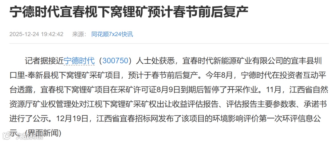 据界面新闻报道,宜春时代新能源矿业有限公司的宜丰县圳口里-奉新县枧下窝锂矿采矿项目,预计于春节前后复产。
