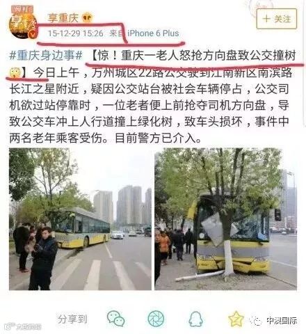 2015年,重庆一老人怒抢方向盘导致公交撞树,致使两名老年乘客受伤。
