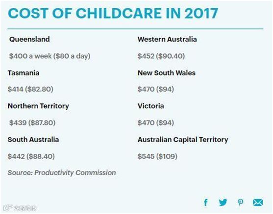 根据澳洲生产力委员会的统计,全澳托儿费用最高的是首领地地区,每周的价格达到了545澳元;最低的昆士兰州,每周的平均托儿价格也要400澳元。