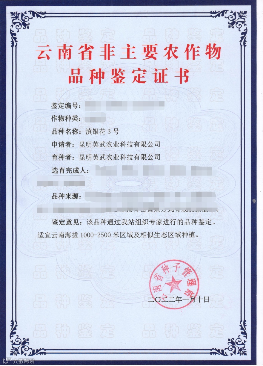 2020年开始,公司致力于“滇银花3号”的产业发展。“滇银花3号”是昆明英武农业科技有限公司自主培育的新品种,已通过云南省种子站品种认定并取得证书。