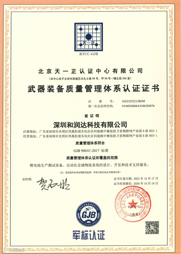 热烈祝贺“深圳和润达科技有限公司”、“东莞和润达智能科技有限公司”顺利通过“国军标质量管理体系”认证,获得由“北京天一正认证中心”颁发的《武器装备质量管理体系认证证书》,表明我司具备“军品装备研发与生产的质量管控能力”,对公司进一步发展军工业务具有重要的里程碑意义。