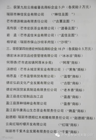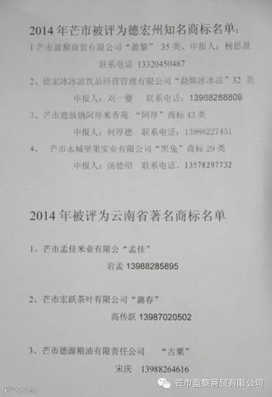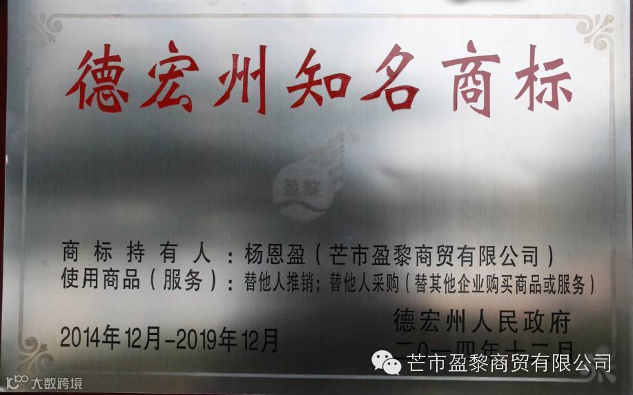 2015年12月,芒市盈黎商贸有限公司“盈黎”商标被我州工商局认定为知名商标,实现了我州知名商标认定的进一步突破。