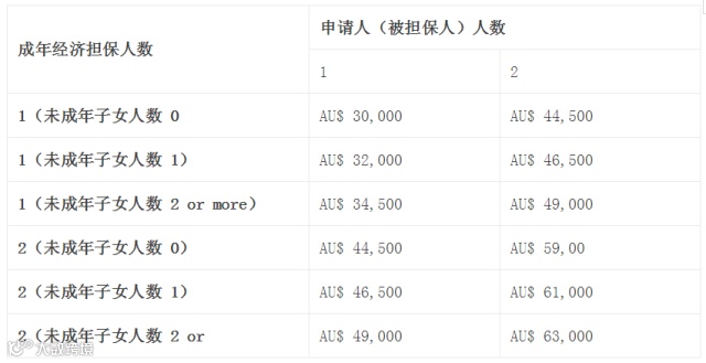 经济担保人在向Centrelink做担保测试时,需要提供其收入证明来满足担保要求。由于经济担保人自身家庭情况及担保人数的不同,Centrelink 对于经济担保人的年收入要求也有相应变化,具体要求如下: