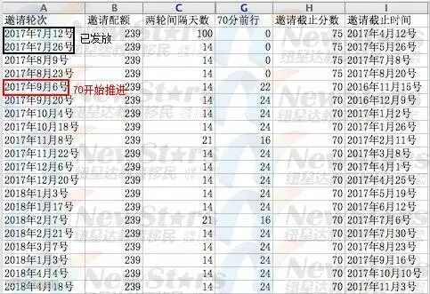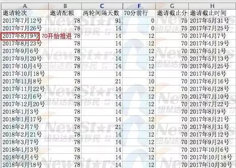 每次现在相当于有310个配额里面,还要先分29个左右到75分,64个左右到70分,还剩余216个名额给65分的申请者。我们根据2017年3月份最后几次邀请数据估算出来,现在大致每天产生18个左右的65分,从8月3号开始,每次大概会前行12天。