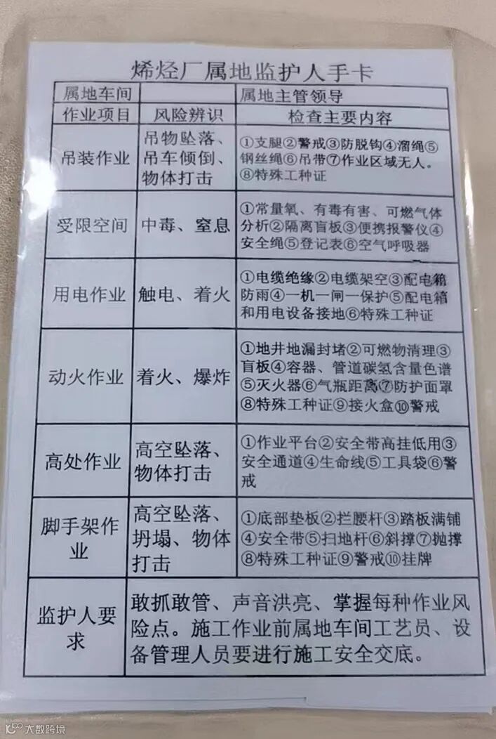 烯烃厂为每名监护人下发《烯烃厂属地监护人手卡》,“手卡”用清晰、简洁的语言对作业项目的风险辨识、检查要点进行强调,对吊装作业、受限空间作业、用电作业、动火作业、高处作业、脚手架作业等不同的作业项目,分别进行辨识风险,强调重点检查内容。