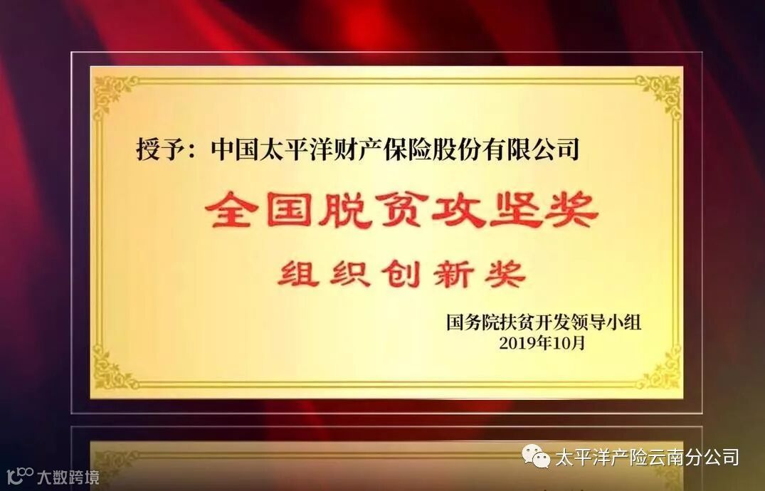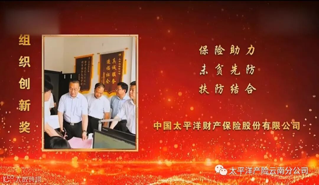 10月17日,在我国第6个扶贫日、第27个国际消除贫困日,中央电视台综合频道播出《攻坚的力量——2019年全国脱贫攻坚奖特别节目》,对获得2019年全国脱贫攻坚奖的单位和个人进行宣传报道,中国太平洋财产保险股份有限公司凭借“防贫保”项目,获得“2019年全国脱贫攻坚奖·组织创新奖”,成为今年唯一获此殊荣的保险企业,“防贫保”项目成为全国首个获此殊荣的保险项目。