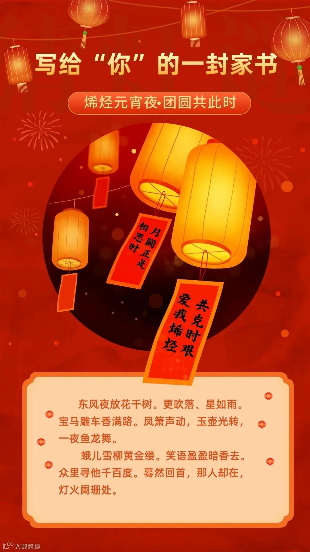 来到烯烃厂这个大家庭已经有一段时间了,虽然过节不能回家,在这里的每个人都很热情,也因为有领导和同事们的关怀和照顾让我感受到了家的温暖,同时我也了解和学到了很多知识,这种忙碌丰富和充实了我的生活,在新的一年里我会再接再厉,在元宵佳节到来之际,诚挚祝同事和家人节日快乐、阖家幸福!