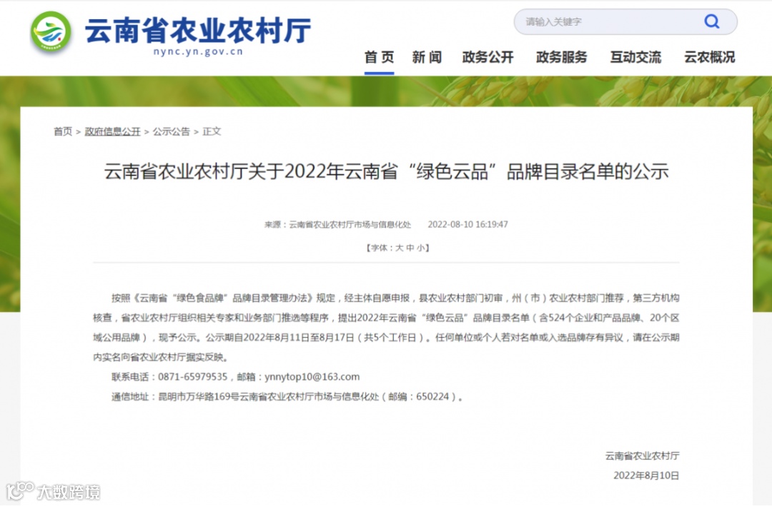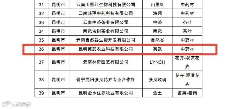 近日,云南省农业农村厅发布了《关于2022年云南省“绿色云品”品牌目录名单的公示》,昆明英武农业科技有限公司成功上榜。