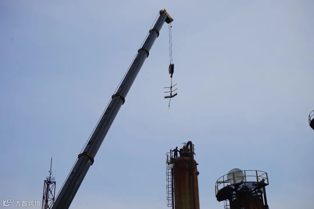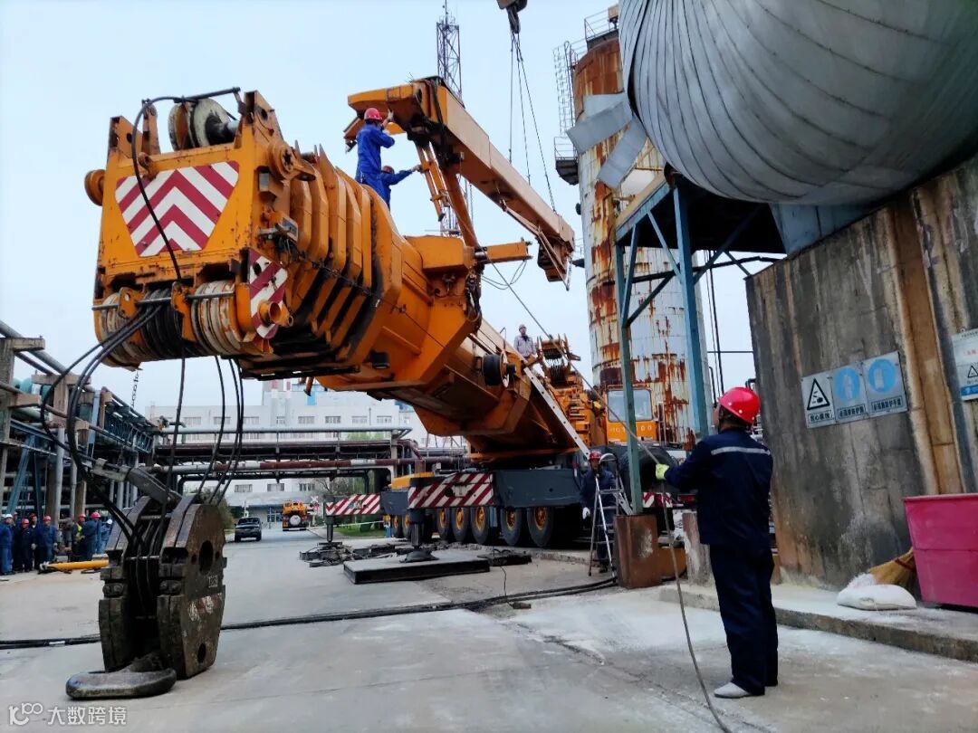 现场准备就绪,在500吨吊车的轰鸣声中,混合器与底座缓缓分离,逐渐升起。