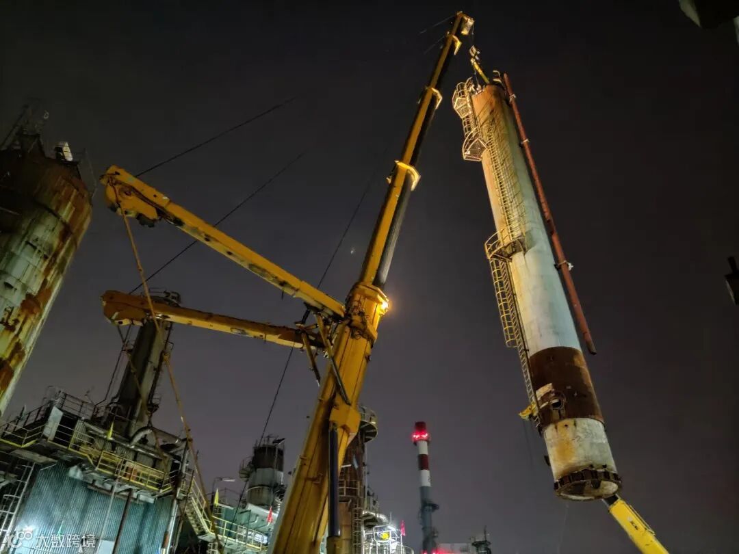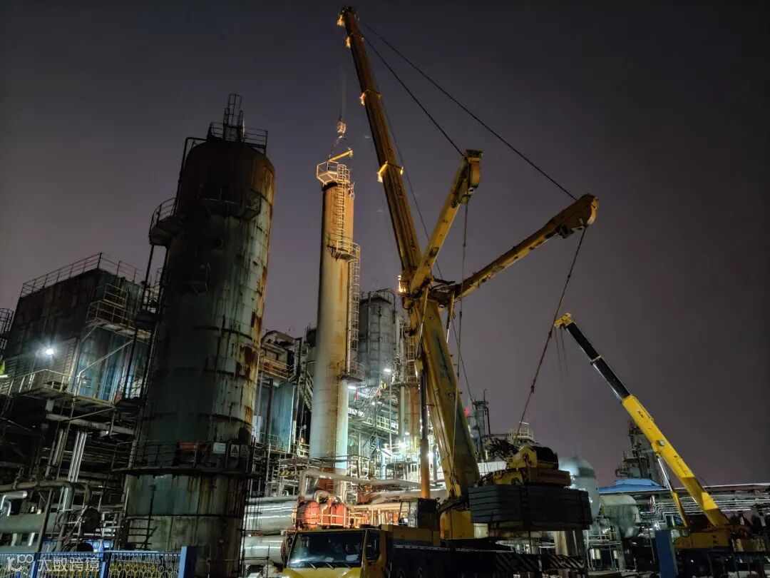 任务明确后,安装工程项目部立即部署,经理杨先尧紧急协调了一台500吨吊车进行主吊,一台130吨吊车配合溜尾。安全设备组组长王永强连夜调整施工方案,对吊装方案先审批、先实施,待设备落地检查后再根据塔盘内件的受损情况完善修复方案。