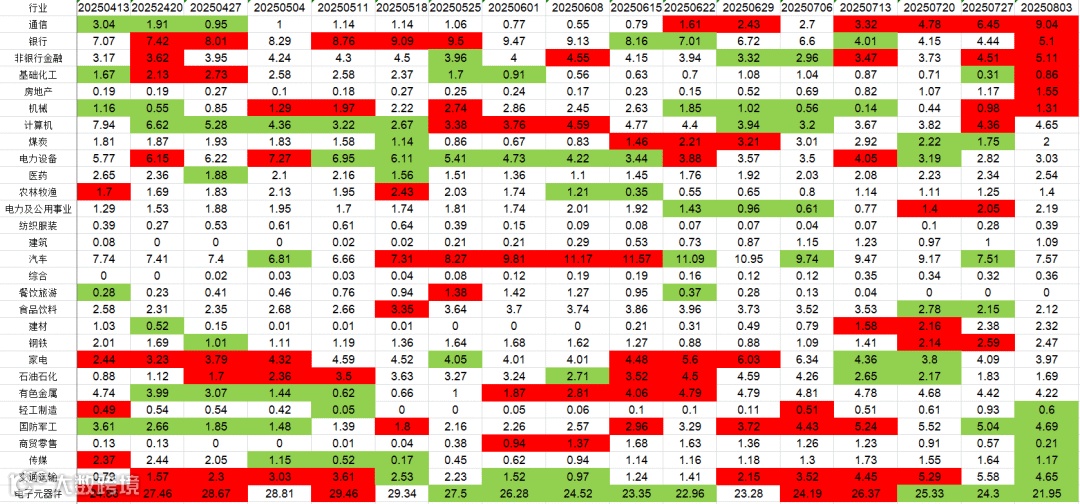 近一周公募基金加仓通信、银行、基础化工、非银金融、基础化工、房地产、机械,减仓轻工制造、国防军工 、交通运输、传媒 电子、商贸零售。