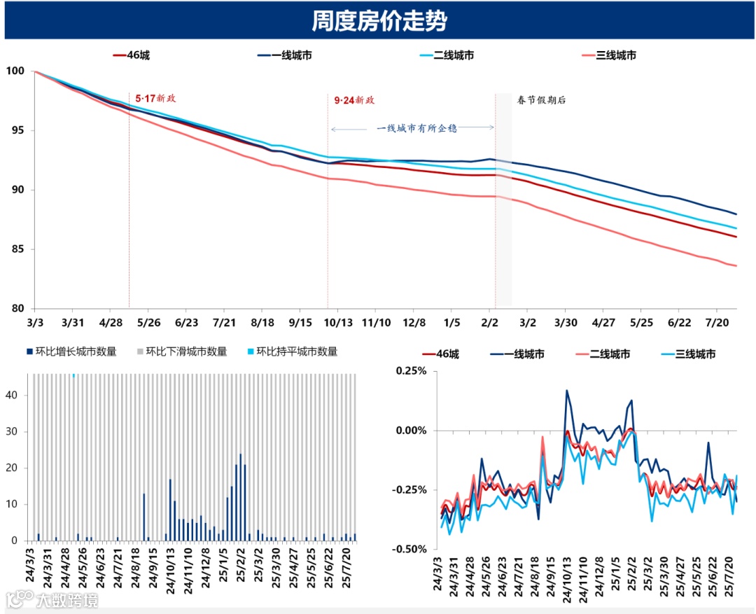 7 月 28 日 - 8 月 3 日,46 城房价指数环比下降 0.24%,一线、二线、三线城市均有不同程度环比下降,不过房价环比上涨城市数量从上周 1 个增加到 2 个。