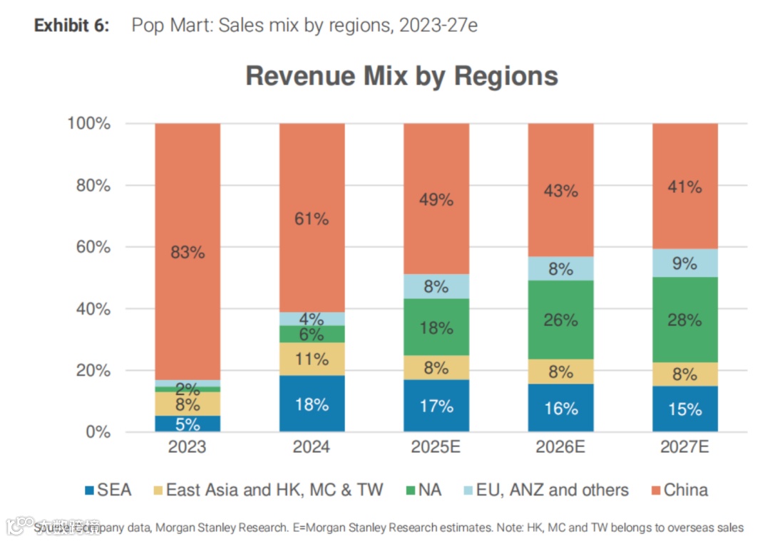 以乐高为例,2024年其在美洲的收入几乎是亚太地区的400%高,而泡泡玛特在北美收入仅为中国地区的10%左右。大摩预计,泡泡玛特在北美的销售额将与中国相当,我们认为泡泡玛特将在2028-2029年实现这一目标。