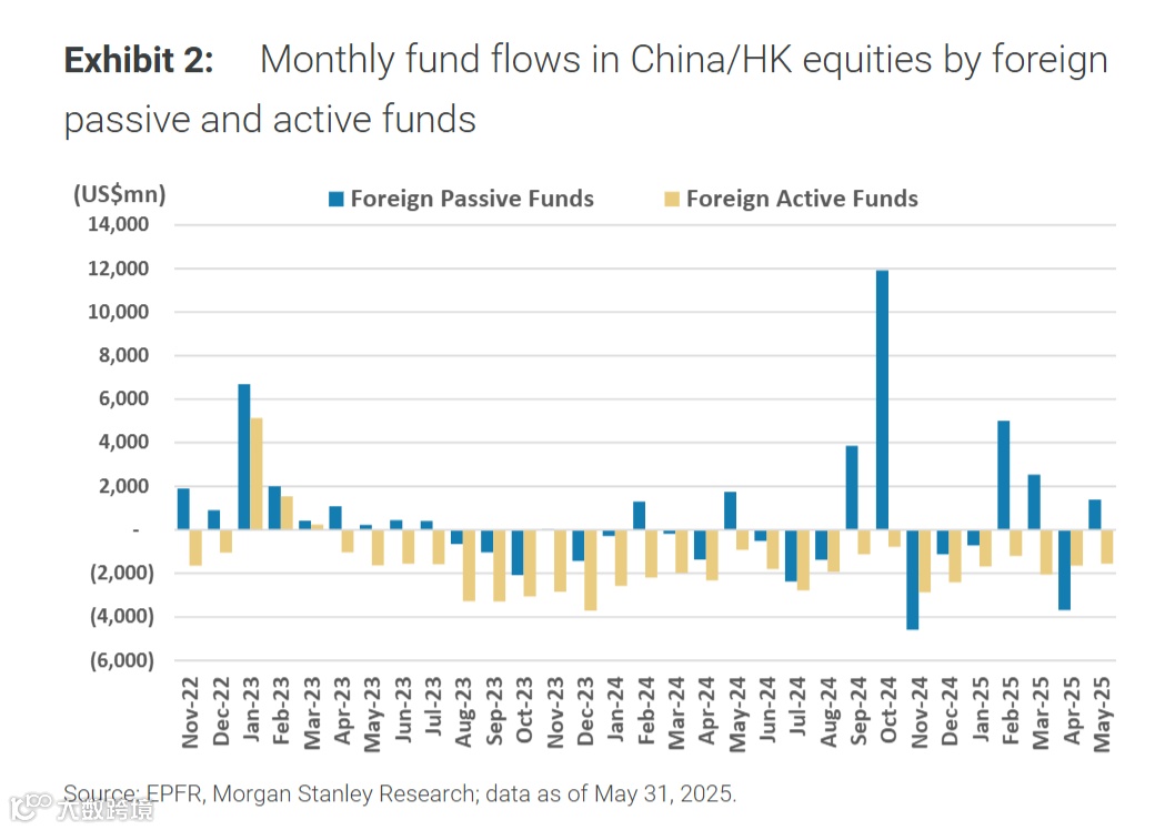 截至 5 月 31 日,累计外资被动流入与 2025 年 3 月初水平相近,而累计外资主动流出达 2022 年底以来历史低谷。
