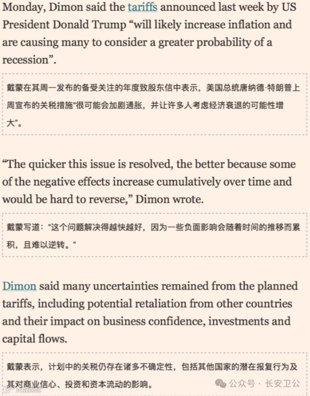8、摩根大通CEO杰米·戴蒙:贸易战恐引发经济衰退与物价上涨
