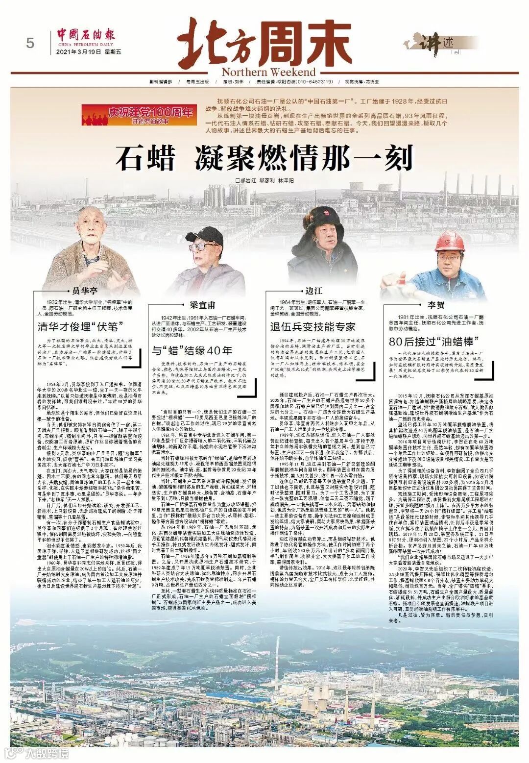 3月19日,中国石油报在庆祝建党100周年栏目刊发《石蜡,凝聚燃情那一刻》特稿,生动讲述一代代石油一厂人倾情奉献感人故事。