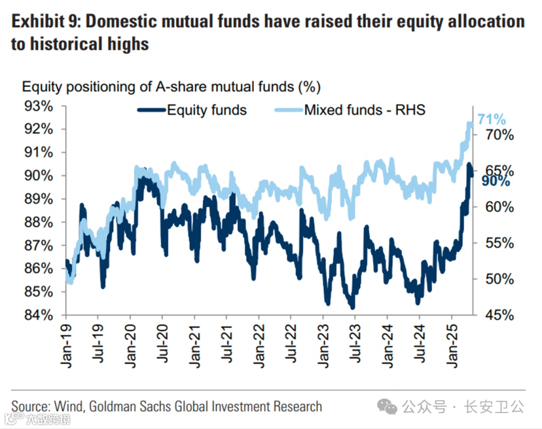股票型基金股票持仓占比攀升至90%,混合型基金也升至71%,双双创下2019年以来新高。