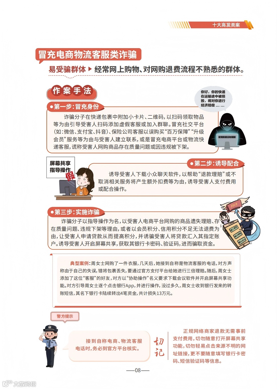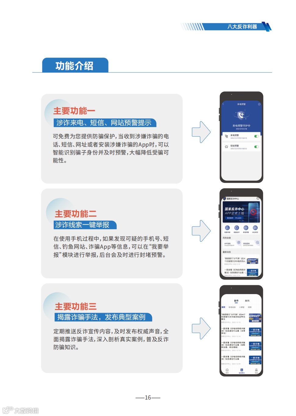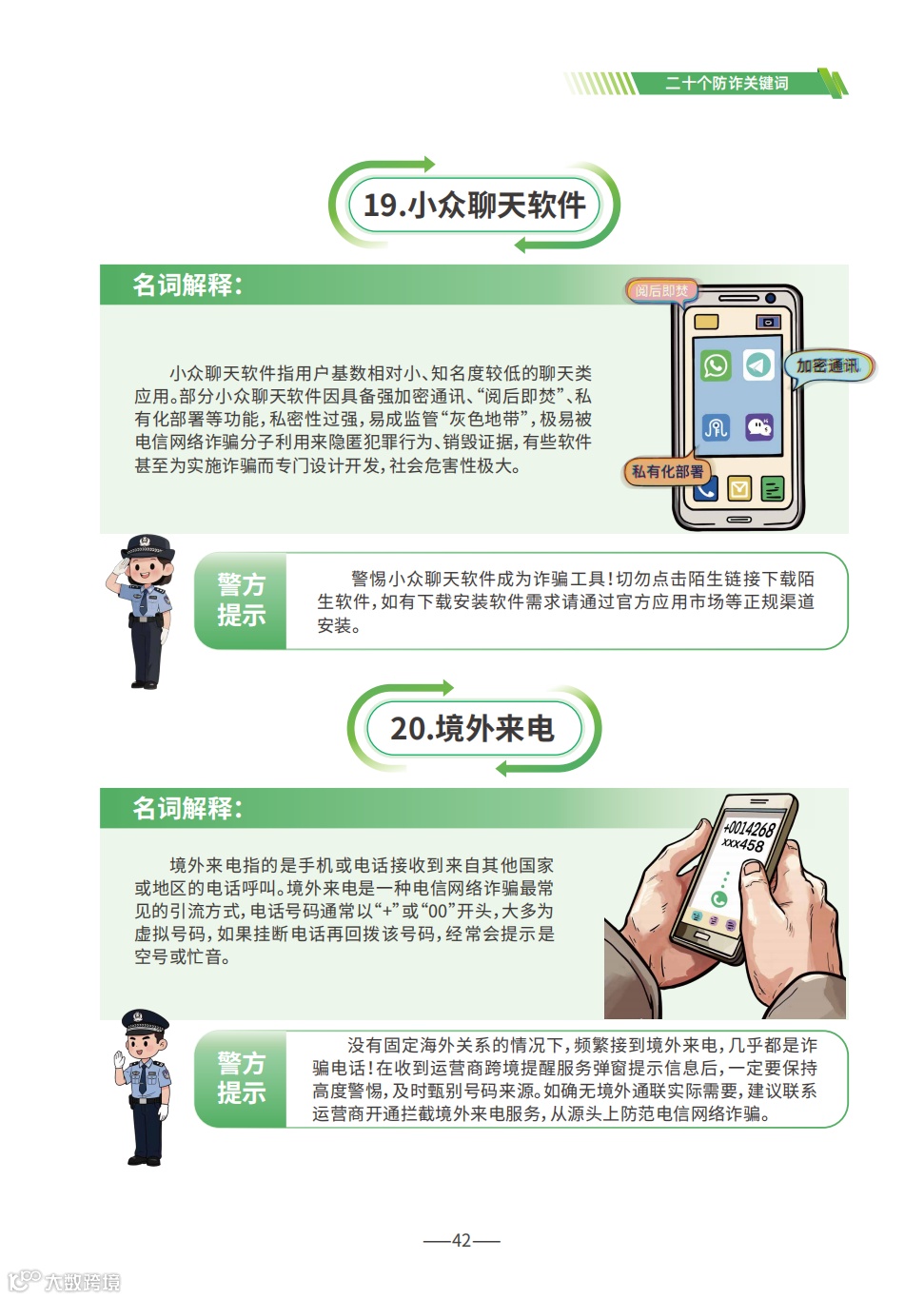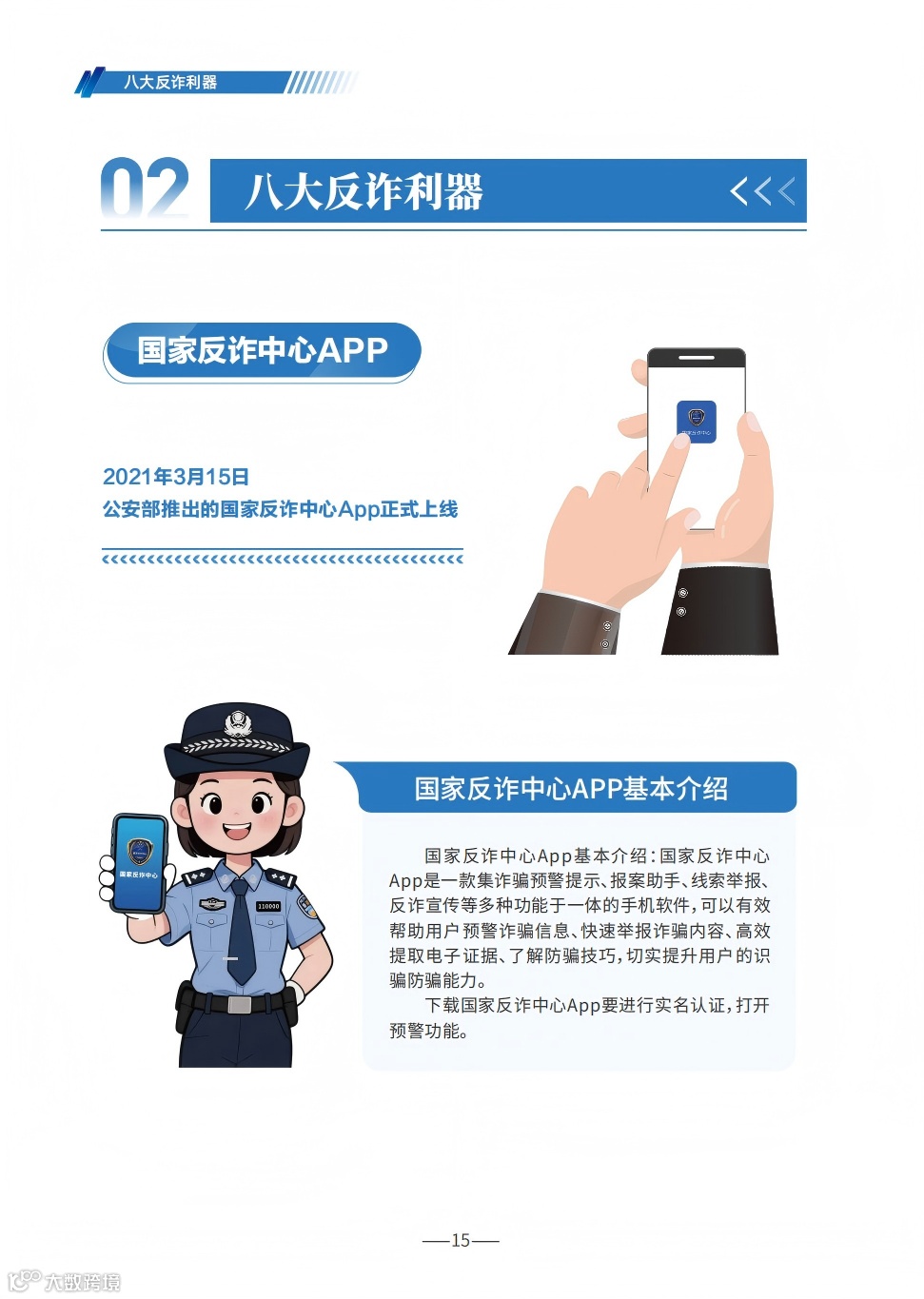 《手册》详细梳理了刷单返利、虚假网络投资理财、虚假购物服务、冒充电商物流客服、贷款征信、冒充领导熟人、冒充公检法、婚恋交友、网络游戏产品虚假交易、机票退改签等10类高发的电信网络诈骗类型,通过典型案例剖析,逐个解析诈骗套路,揭批作案手法,为易受骗群体“量身定制”反诈防骗提示。同时,《手册》详细介绍了前期公安部会同工信部、中国人民银行推出的七大反诈利器——国家反诈中心APP、96110预警劝阻专线、12381涉诈预警劝阻短信系统、全国移动电话卡“一证通查”、全国互联网账号“一证通查”、反诈名片、云闪付APP“一键查卡”,以及今年工信部推出的第八个反诈利器——跨境提醒服务,帮助群众有效甄别境外来电。此外,《手册》首次总结提炼了帮助群众快速破译骗局的20个防诈关键词,切实构筑拦截电信网络诈骗的“防火墙”。