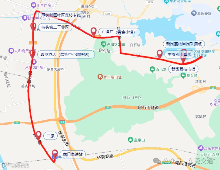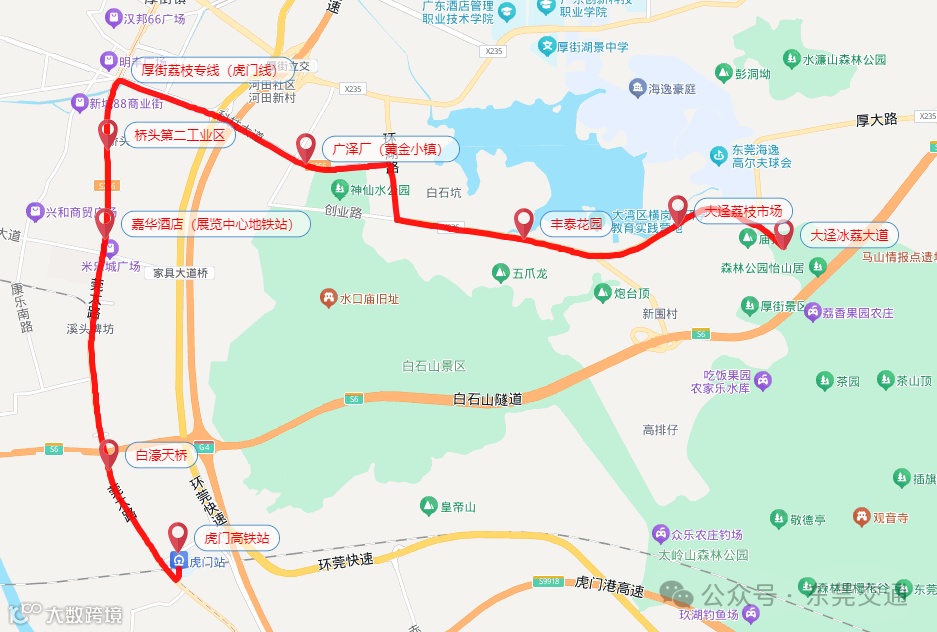 虎门高铁站—白濠—嘉华酒店—桥头第二工业区—广泽厂(黄金小镇)—丰泰观山碧水—新围荔枝市场—新围荔枝果园(新围荔枝果园采摘点)