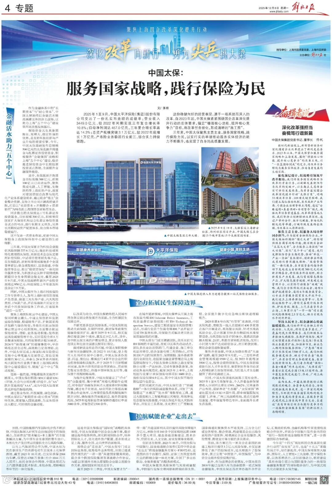 上海市国资委党委、市国资委与解放日报社联合推出“深化改革向新行 勇为尖兵挑大梁”——聚焦上海国企改革深化提升行动主题宣传。12月8日,解放日报专版刊发《中国太保:服务国家战略,践行保险为民》,其中“奋楫者说”栏目刊发中国太保党委书记、董事长傅帆文章。
