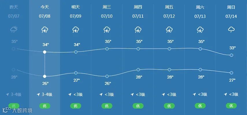 预计我市6-7日受副热带高压控制,天气高温炎热,大部分时间以多云为主,间中有阵雨或雷阵雨;8-13日多云,有阵雨或雷阵雨、局部雨势较大;展望14日有短时阵雨或雷阵雨。