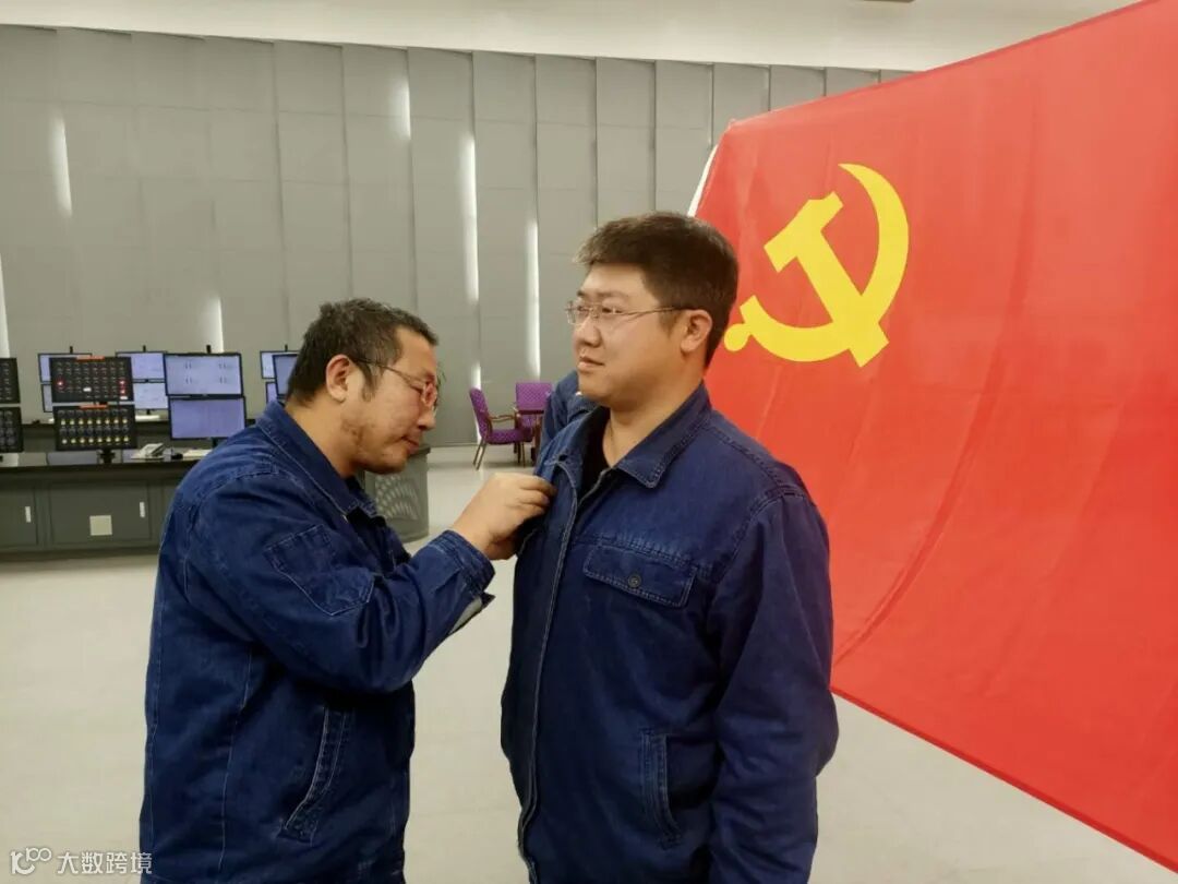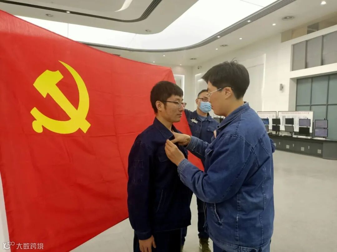 全体与会党员在庄严的党旗下再次郑重宣誓。随后,支部委员为新党员佩戴党徽。