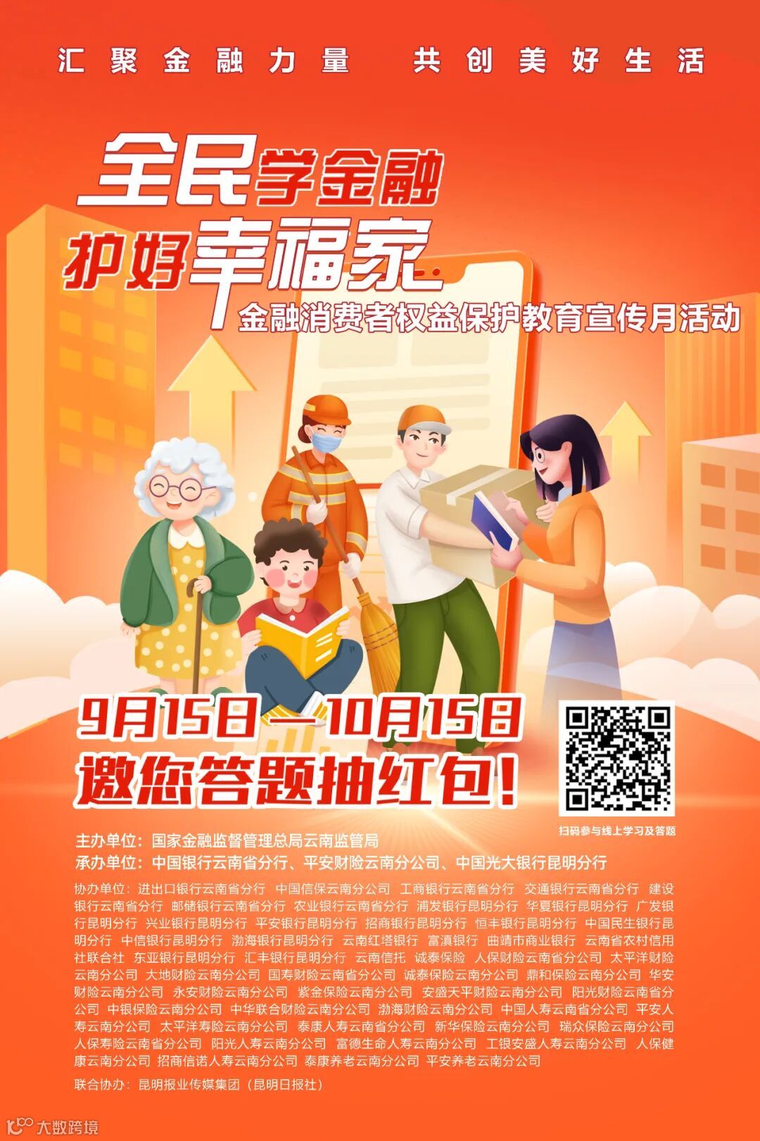 9月15日—10月15日,由国家金融监督管理总局云南监管局主办,中国银行云南省分行、平安财险云南分公司、中国光大银行昆明分行承办,53家银行保险机构共同协办的“全民学金融 护好幸福家”金融消费者权益保护教育宣传月活动将正式开启。
