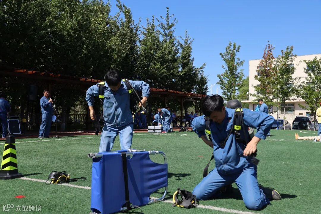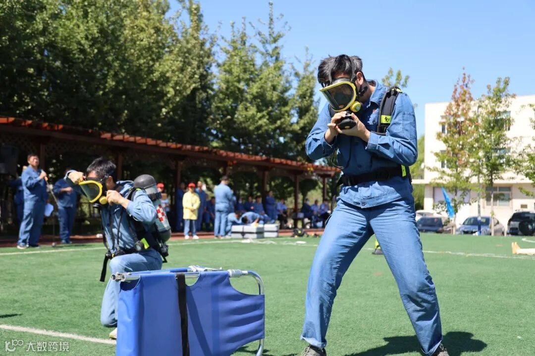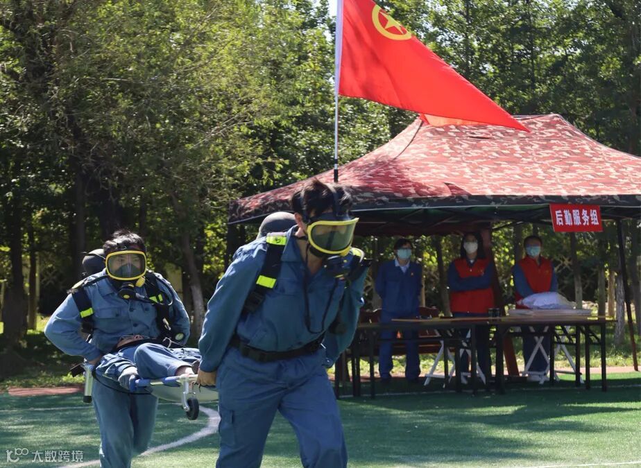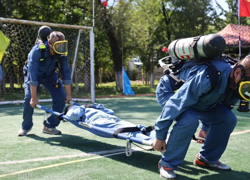 倒背气瓶;扣紧腰带;佩戴面罩;面罩密封;连接供气阀等等一系列动作。无不体现参赛队员操作精准,动作一气呵成,20秒完成穿戴,拿起担架,冲入事故现场,那股冲锋陷阵,英勇无敌换来掌声不断。