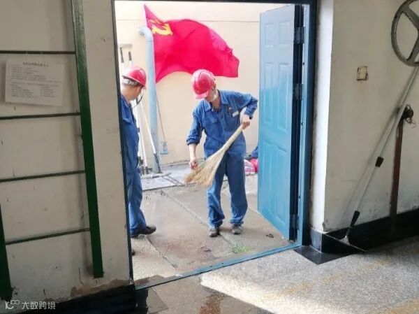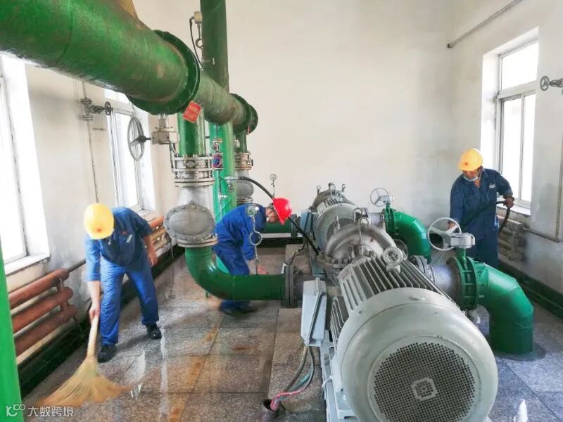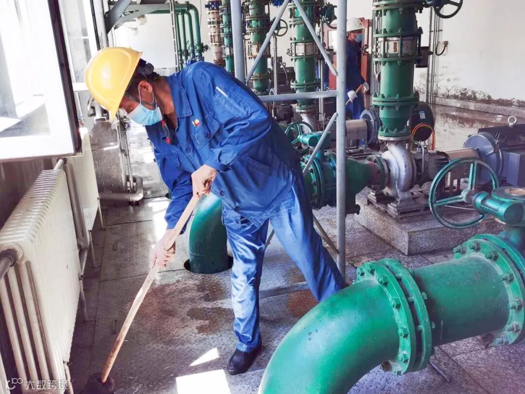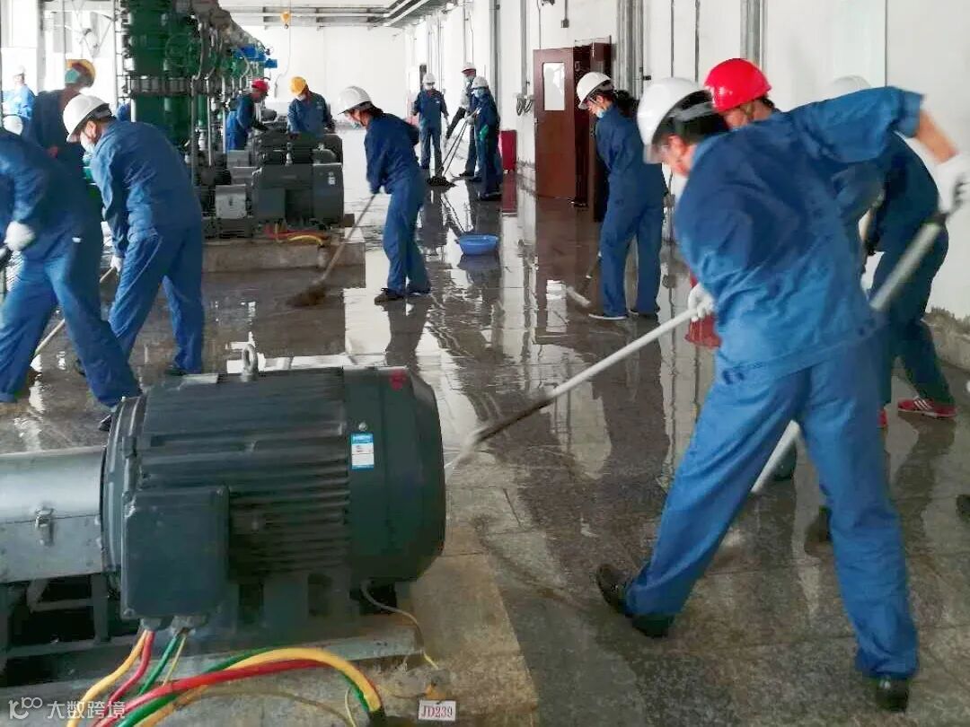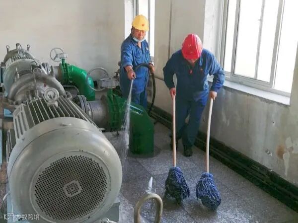 有的在冲洗泵房,有的在清扫地面