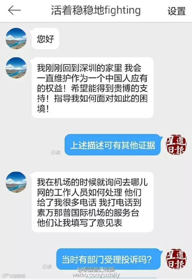 泰国星暹传媒的微博在1月6日的凌晨接到网友‘活着稳稳地fighting’的投诉,在乘搭航班从曼谷飞往深圳时,因为出境卡放在了行李箱子里托运了,所以她只好向机场的一名女性工作者询问新的出境卡。