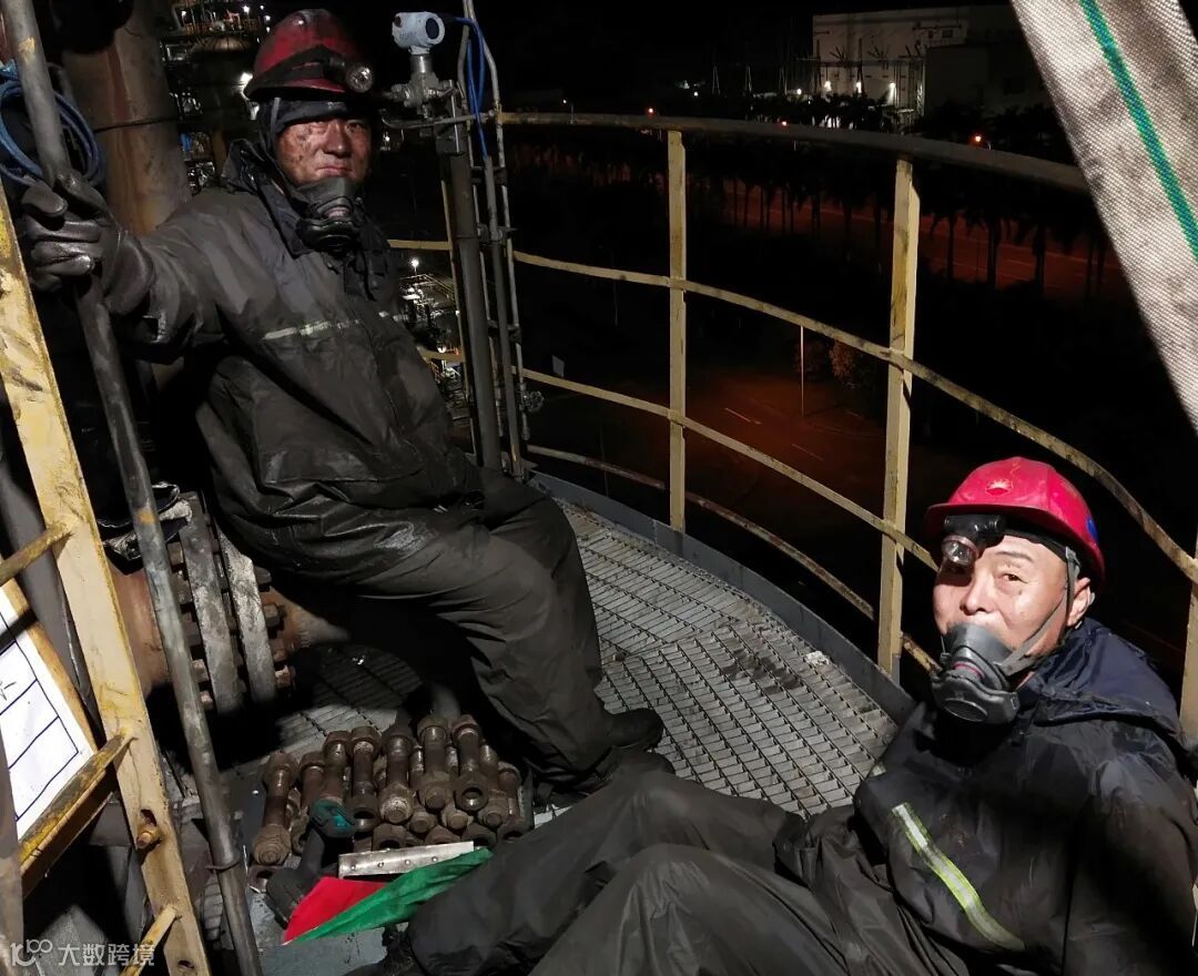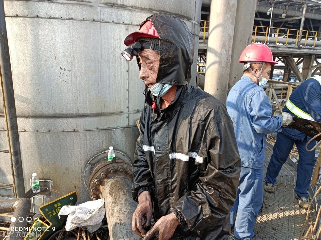 塔内温度高达40多度,他们穿着厚厚的连体服,一会儿工夫,豆大的汗珠一颗颗滚落下来,连体服里捂得都是汗水,连体服外湿气、蒸汽环绕,湿热难耐。施工人员咬牙坚持作业,16小时内完成全部40层塔盘的拆除工作。