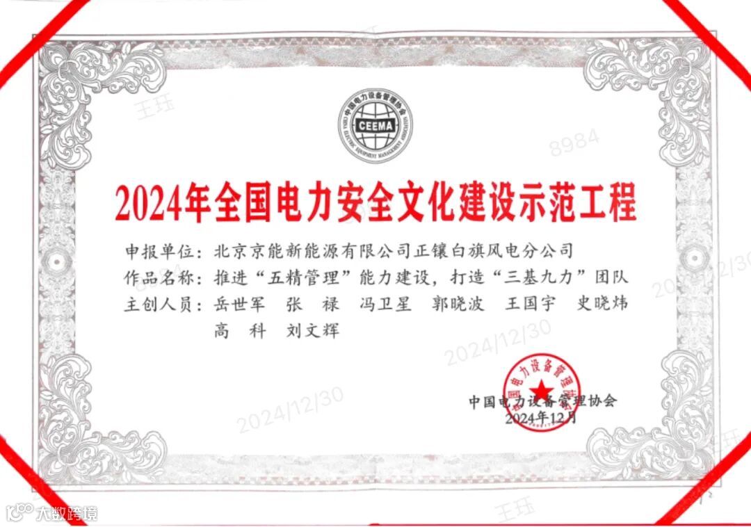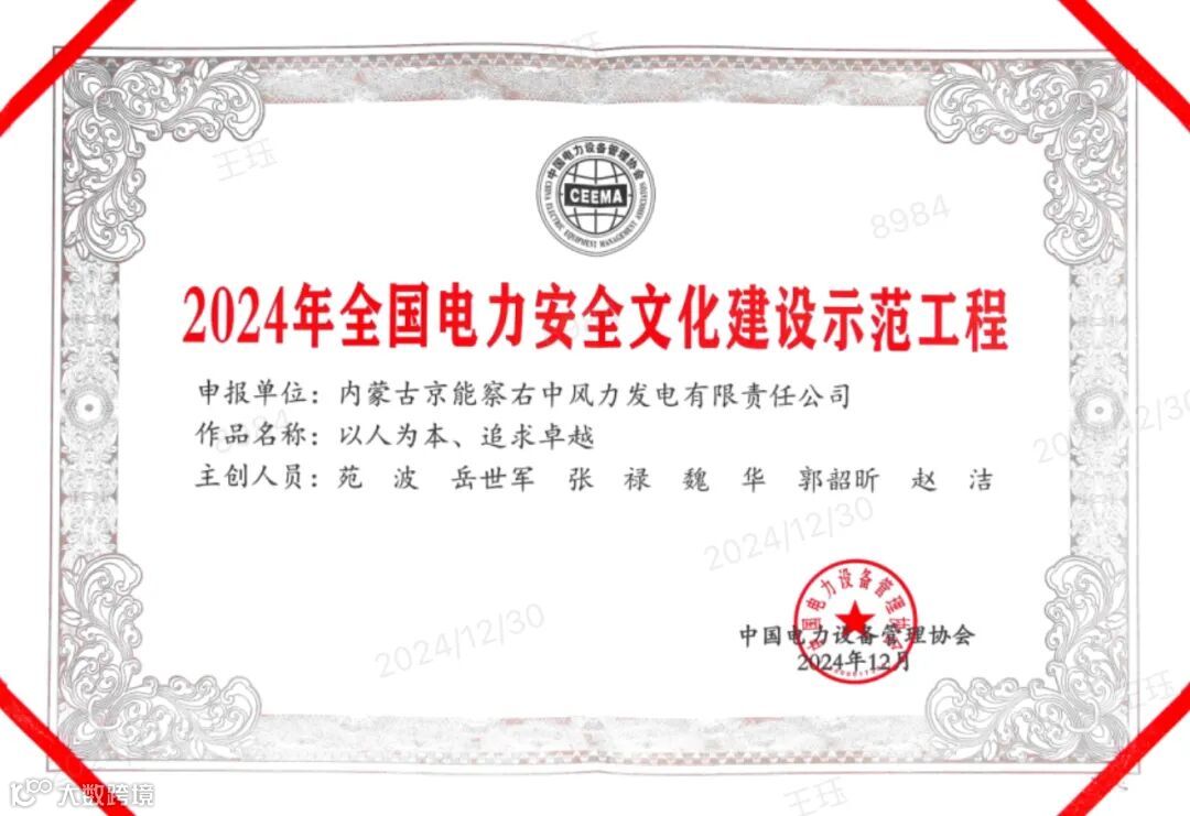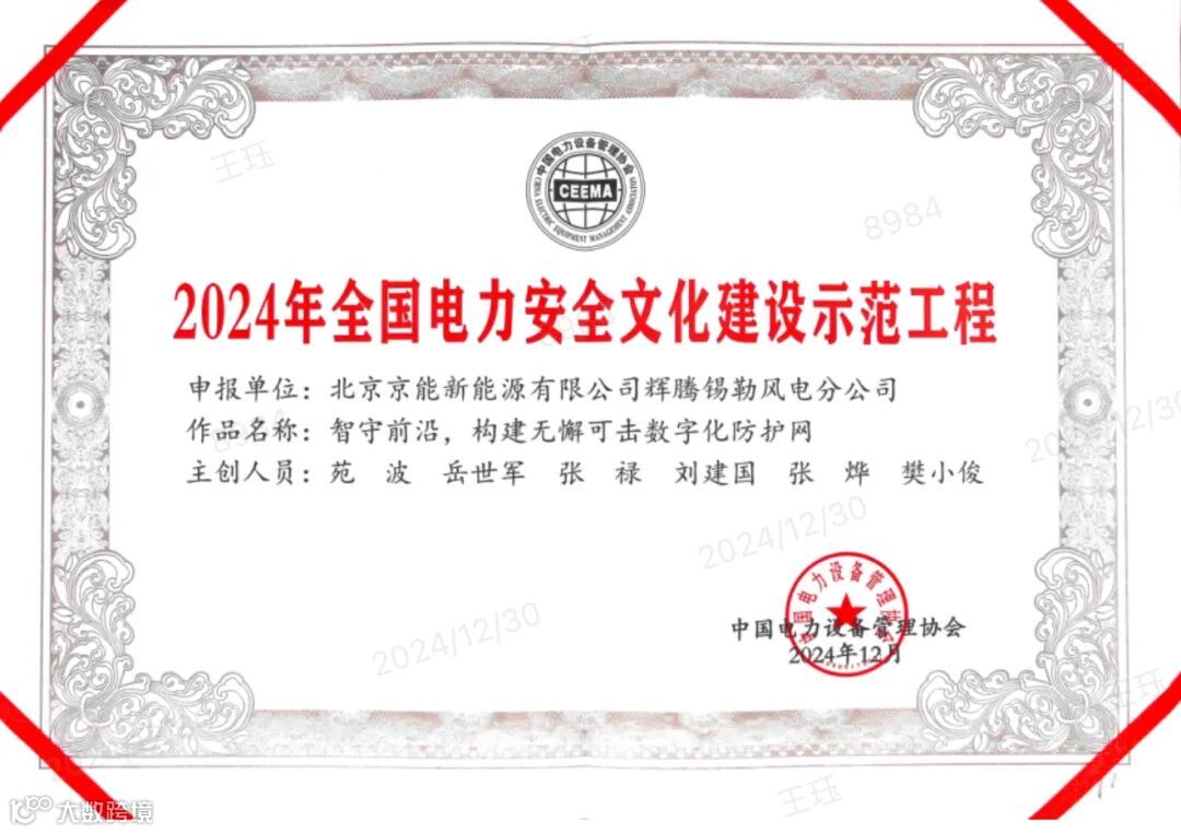 2024年,在全国电力安全文化建设示范工程创建过程中,内蒙古分公司再获殊荣!所属6家单位经过精心准备与激烈角逐,在全国1149家申报单位中脱颖而出,获全国电力安全文化建设示范工程称号,进一步提高了内蒙古分公司在行业内的影响力,有力彰显了公司安全管理的“京能特色”。