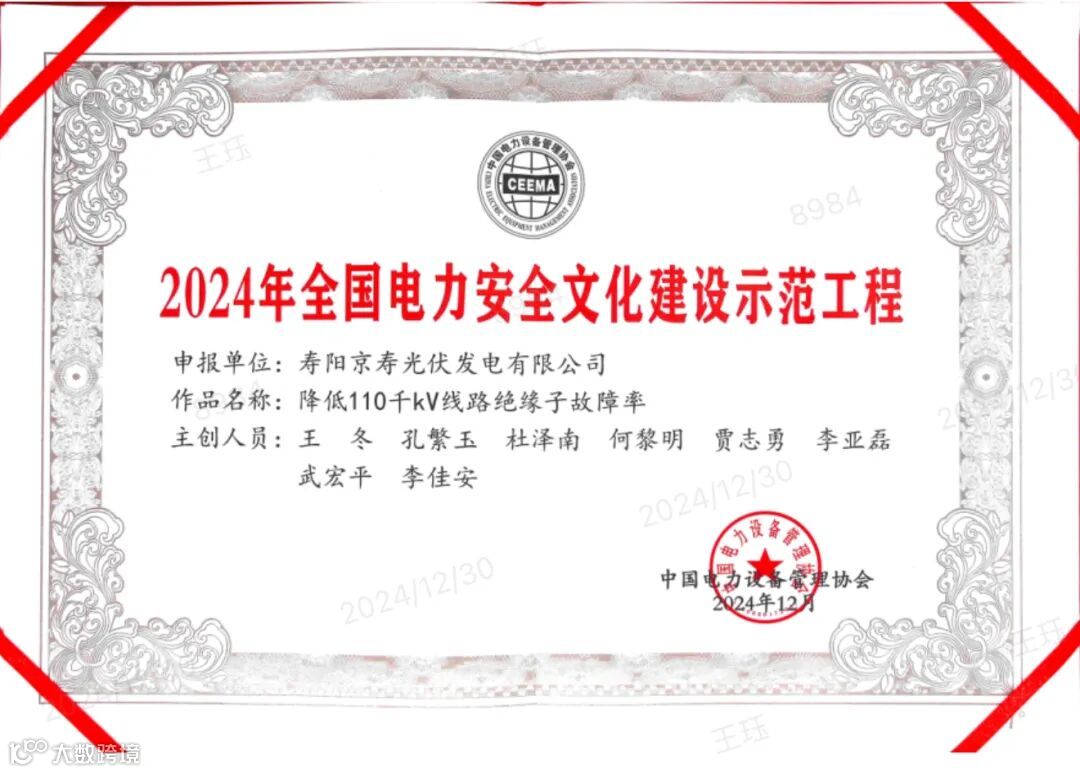 内蒙古分公司所属辉腾锡勒风电场、察右中风电场、哲里根图风光电站、商都风电场、凉城风电场、寿阳光伏电站6家单位荣获2024年度全国电力安全文化建设示范工程称号!