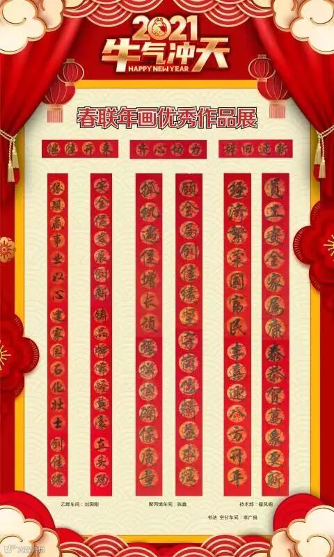 2021年春联和年画征集的主题是“爱我烯烃.牛气冲天”。通知下发后,得到了全厂干部员工的积极响应,基层各单位积极发动员工广泛参与,并选拔出优秀作品推荐到党群工作部。