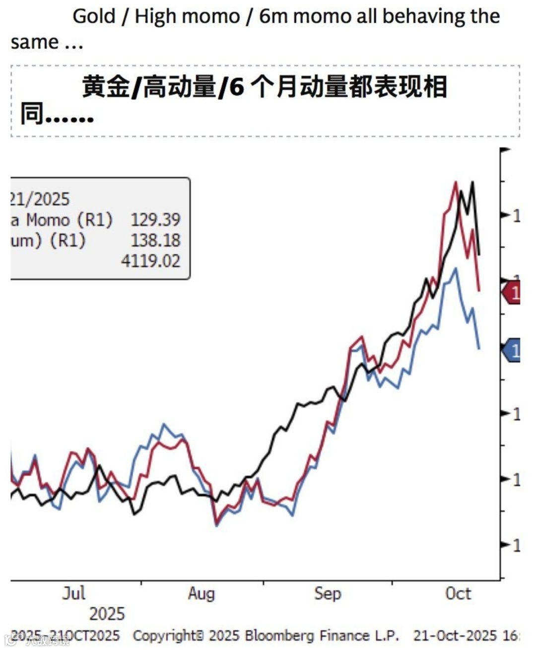 过去六个月以来,黄金的走势与高动能板块高度相关。