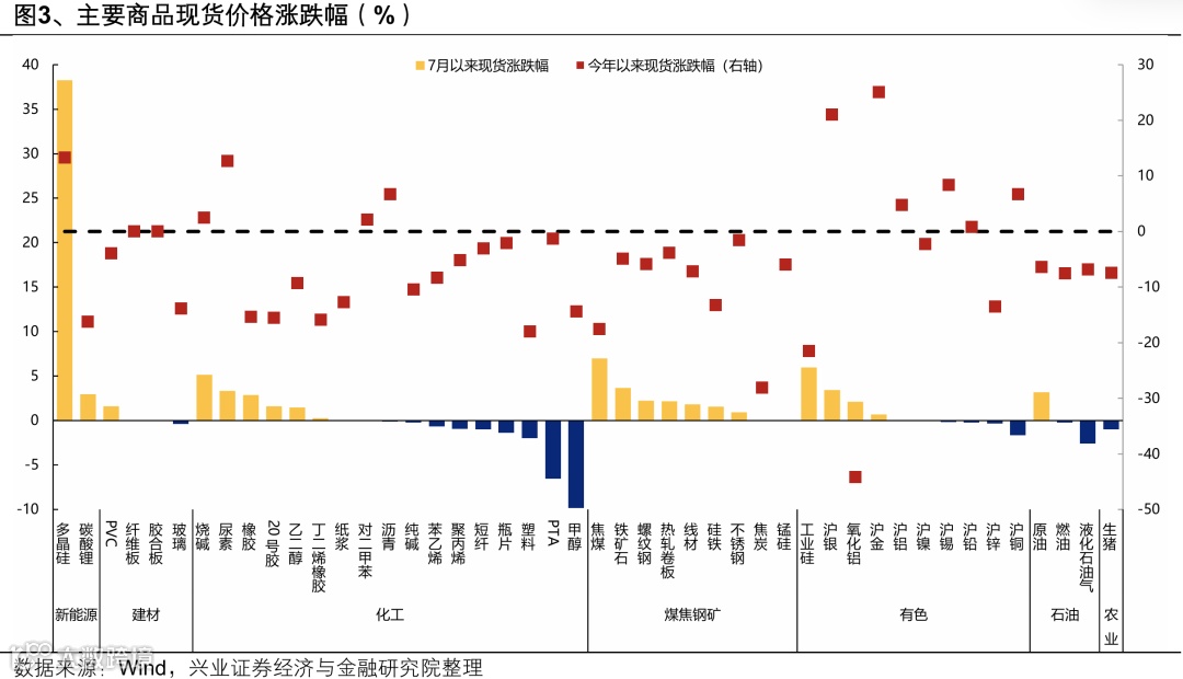 7月以来期货价格上涨较多的品类包括新能源产业链(多晶硅、碳酸锂)、黑色系(焦煤焦炭、铁矿石、螺纹钢等)、建材(玻璃、PVC)、化工(碱、尿素、纸浆、橡胶、苯乙烯等)、有色(氧化铝、银、工业硅等)、原油、生猪;