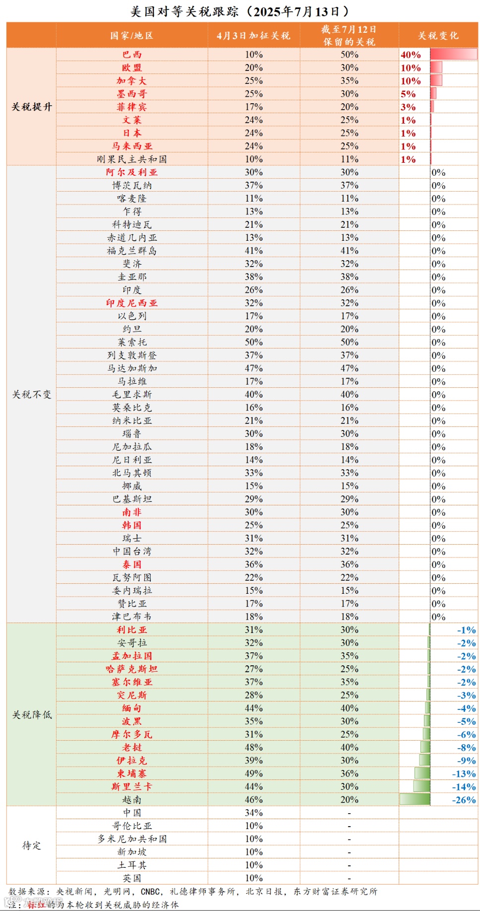 但美国主要贸易伙伴税率上升较多,如巴西税率较4月3日提升40个百分点,欧盟、加拿大均提升10个百分点,墨西哥提升5个百分点,日本提升1个百分点。美国主要贸易伙伴中,仅有越南关税下降26%。