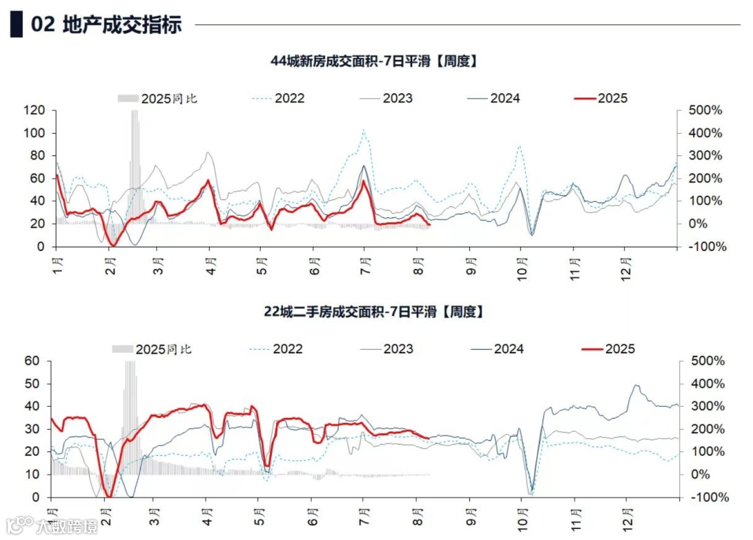 上周贝壳带看量、门店认购量环比降;新房和二手房网签成交面积环比降。8 月 1 - 8 日,44 城新房销售面积同比 - 20%(7 月 - 19% ),22 城二手房成交面积同比 -1%(7 月-6% )