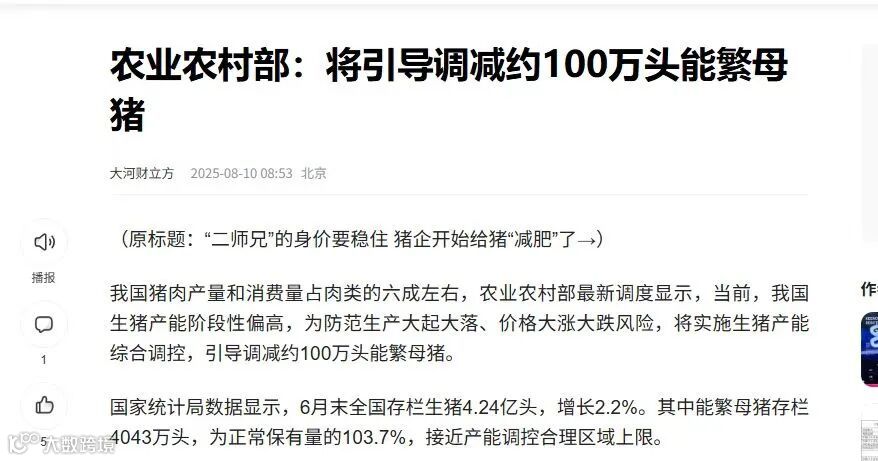 最新调度数据显示,因生猪产能阶段性偏高,为防生产、价格大幅波动,实施产能综合调控,将引导调减约 100 万头能繁母猪。